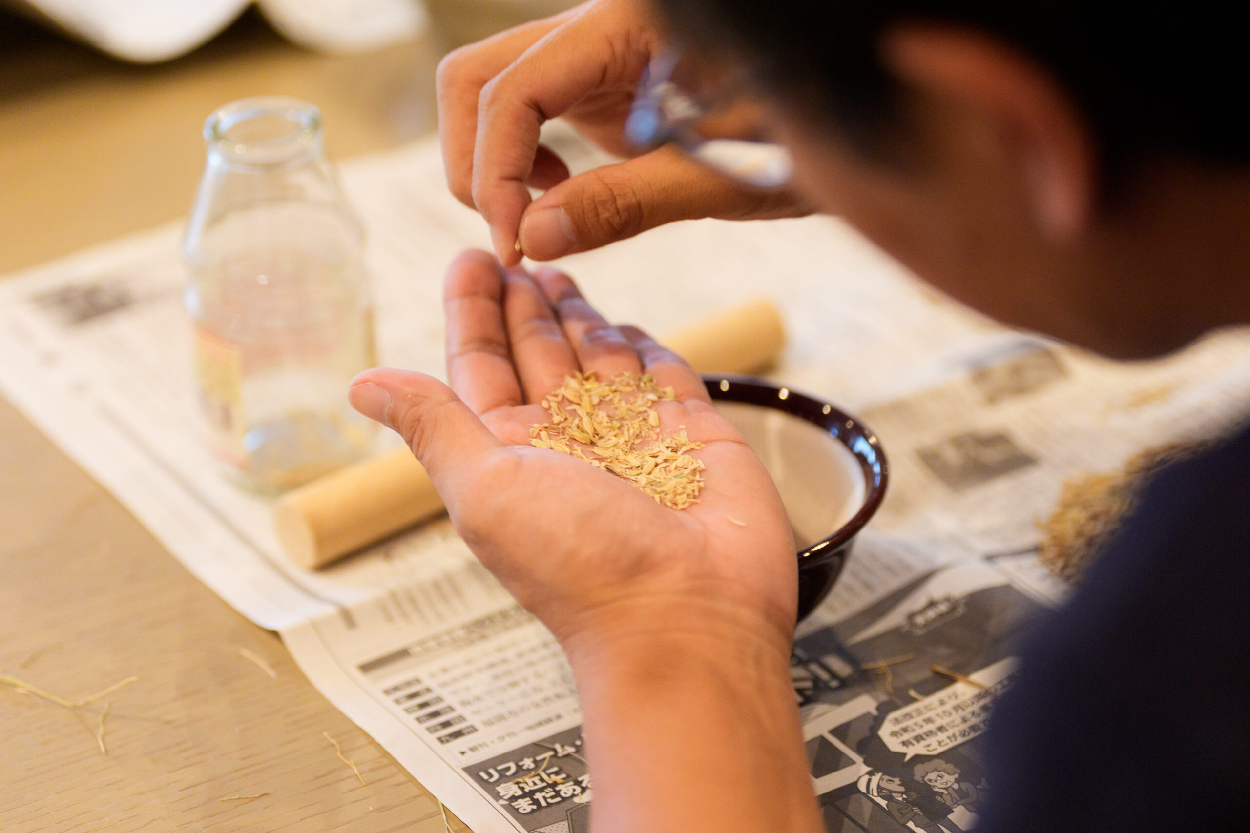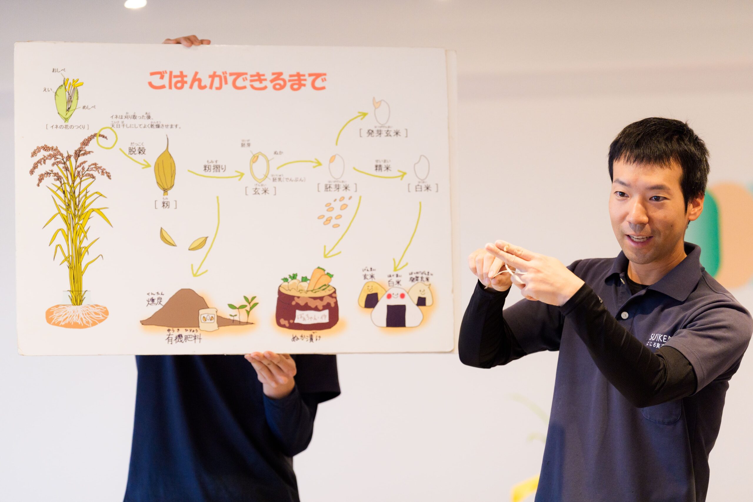 ▲屋上構築へアドバイスをいただいている水研クリエイトさんによる「ごはんができるまで」の講義もありました。刈り取った稲は約2週間、しっかり乾燥させてから脱穀します。昔ながらの仕組みに触れながら、はじめて行う方が多く、シンプルな作業ながら「楽しい」「意外とクセになる」と言った声が上がりました。他にも「普段の食事をもっと大事にしたくなる」という声も多く寄せられ、お米が食卓に届くまでの手間と価値が実感できる学びも得ることができました。