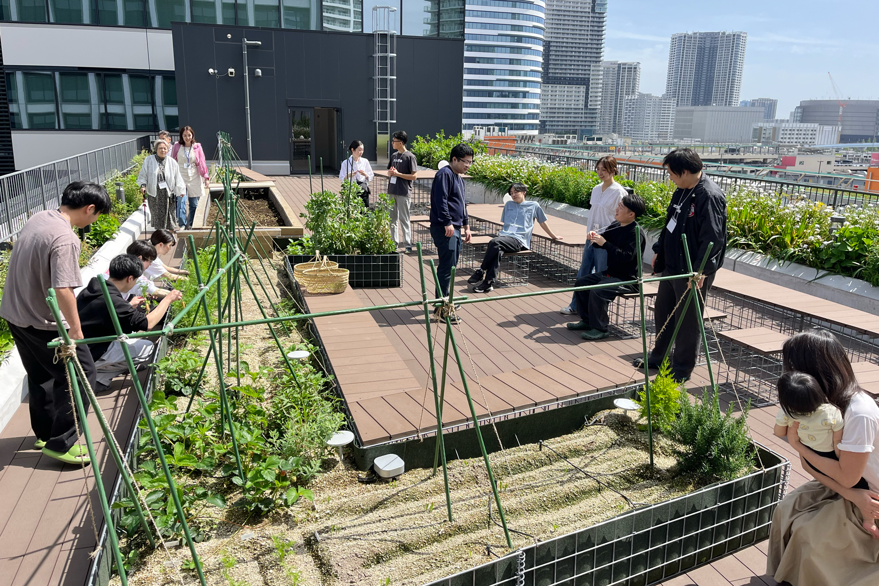 イベントの後半では、レインボーブリッジを臨む屋上菜園へ移動。にんじんやいちごの収穫を楽しみながら、これからTAMESUでやってみたいことについても会話が広がりました。